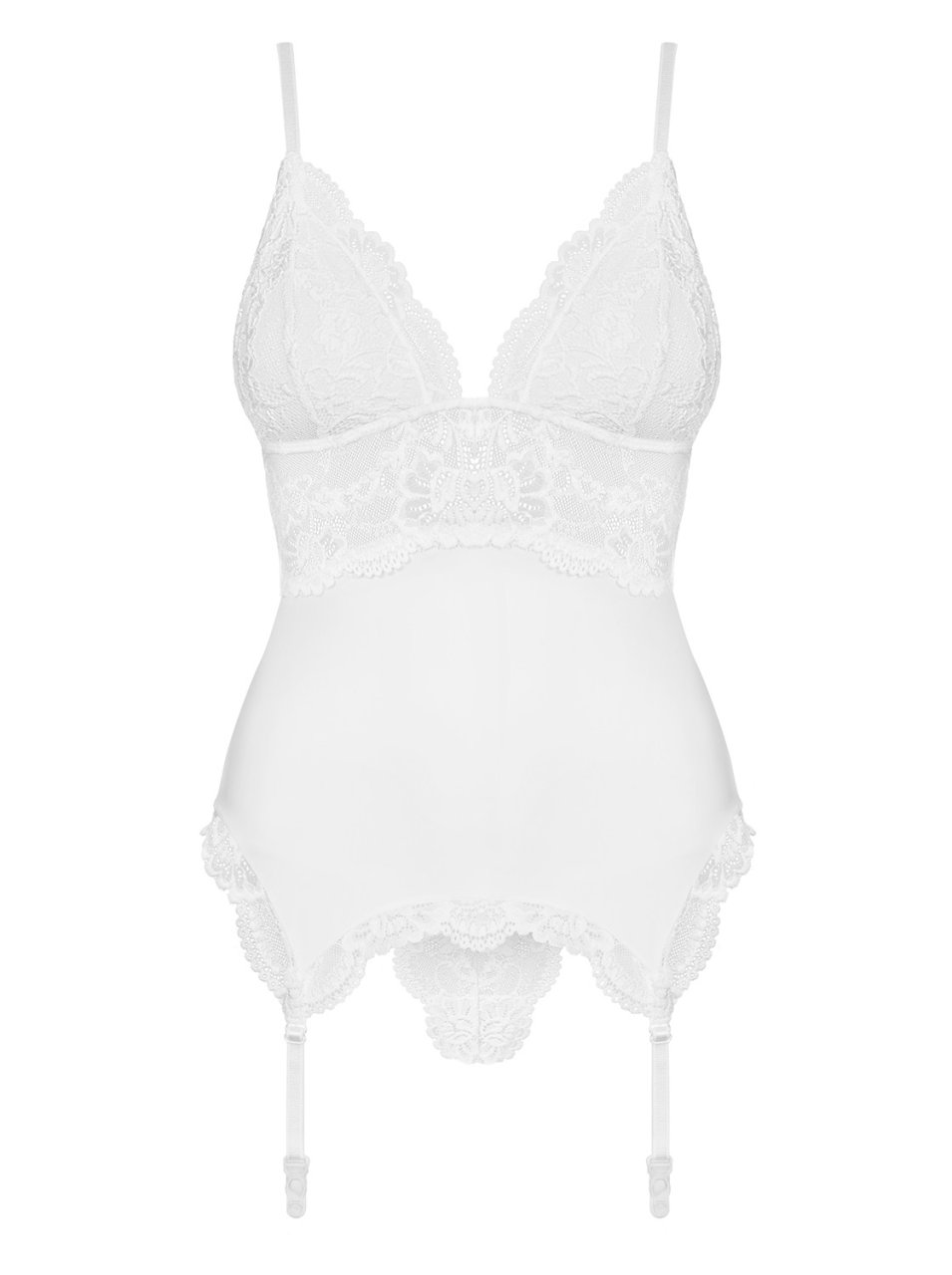 Vous allez devenir une bombe, oui c'est le mot, avec cette superbe gu�pi�re blanche d'un tissu extensible et moulant. Les bonnets sont avec un rembourrage pour le confort et la beaut� des seins et bretelles r�glables. Une jolie bande de dentelle blanche transparente se trouve sous la poitrine et sublime le dos.De tr�s belle finition pour cette gu�pi�re � laquelle vous pouvez y ajouter des bas (non inclus) gr�ce aux jarretelles r�glables. Le string blanc avec de la dentelle est compris.Composition : 85% Polyamide, 15% Elasthanne
