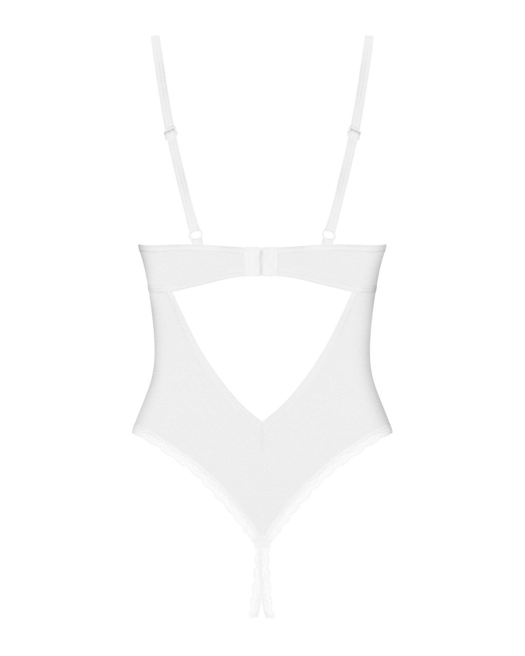 Body ouvert Alissium�Un body blanc neige sexy avec un entrejambe ouvert. La forme minimaliste combin�e � des accessoires subtils mettra en valeur vos courbes f�minines. Une id�e parfaite pour des occasions romantiques qui vous laisseront tous les deux enchant�s!�- body blanc avec entrejambe ouverte- d�collet� profond- armatures en bonnets souples - mat�riel transparent - dentelle � motif g�om�trique- pendentif en or rose- 94�% polyamide, 6�% �lasthanne- con�us dans l?UE- sans nickel
