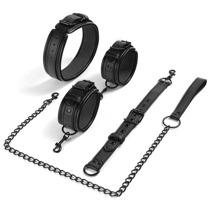 Accessoire avec un collier de 4.5 cm de largeur et un tour de cou de 42 à 54 cm.La laisse mesure 60 cm de longueur.Les menottes de poignets ont un tour ajustable de 21 à 32 cm.Attache centrale ajustable.En simili avec intérieur néoprène.
