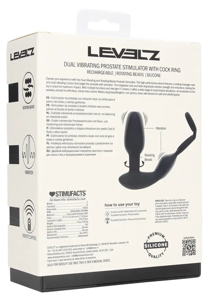 Longueur insérable de 10.5 cm et largeur maximale de 3.8 cm.Avec 8 modes qui se combinent : Vibrations sur le plug et sur la partie en contact avec le périnée, billes rotatives à la base du plug.Avec une télécommande.En silicone.