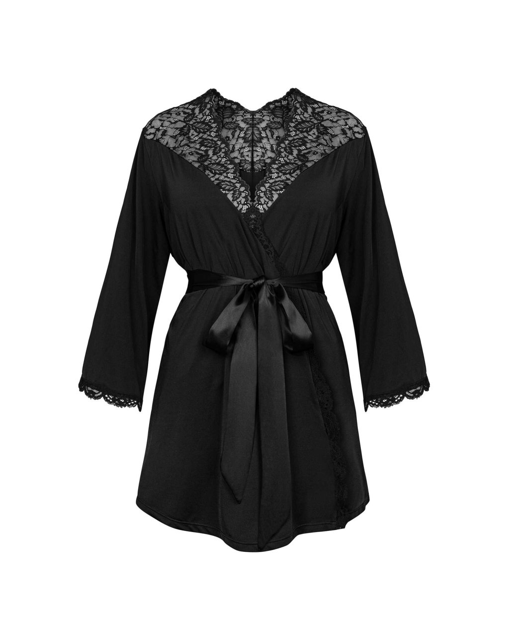 Peignoir Bellastia Ce peignoir est l'essence de la f�minit�. Voyez simplement � quel point il �pouse parfaitement le corps. Plus cette dentelle et une ceinture accentuant la taille. N'h�sitez plus et offrez-vous un cadeau qui vous fera vous sentir sensuelle et sexy � tout moment de la journ�e ! D�couvrez plus de d�tails:- un �l�gant peignoir noir- la ceinture souligne parfaitement la taille- dentelle translucide ? d�tail s�duisant- tissu doux ? assure le confort (85 % polyamide, 15 % �lasthanne)