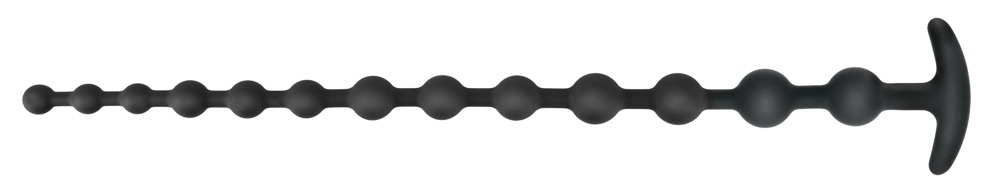 Longueur de 48 cm pour aller profondément.La largeur va de 1.6 à 3 cm au fur et à mesure de l'insertion des différentes boules.La structure est souple. En silicone.