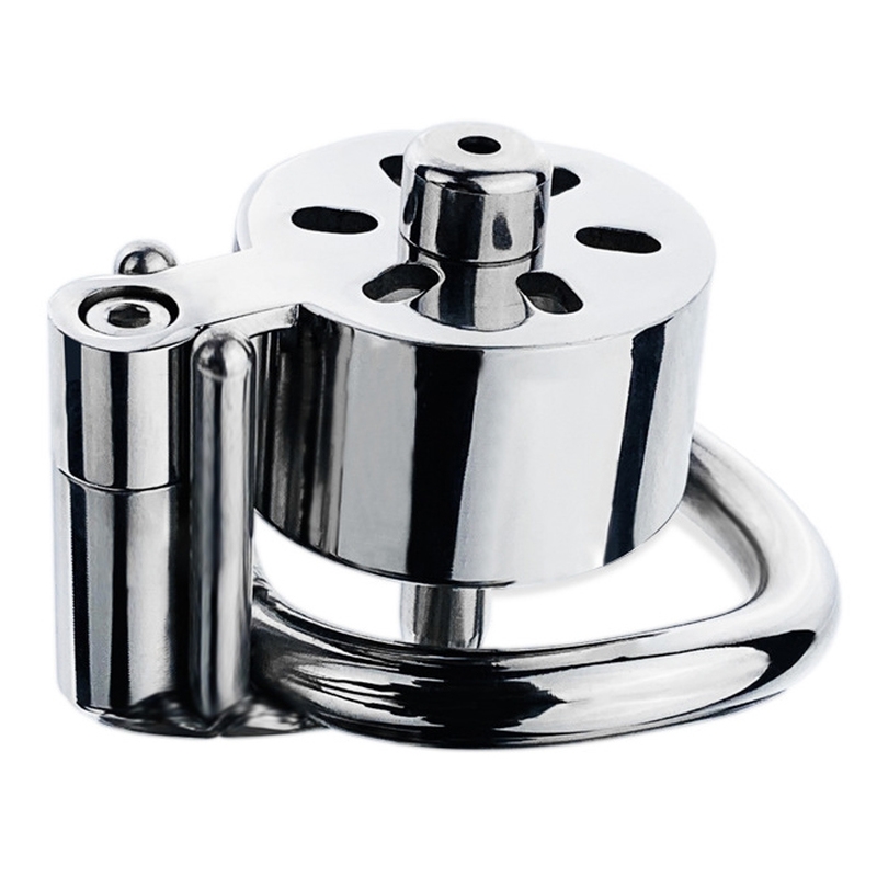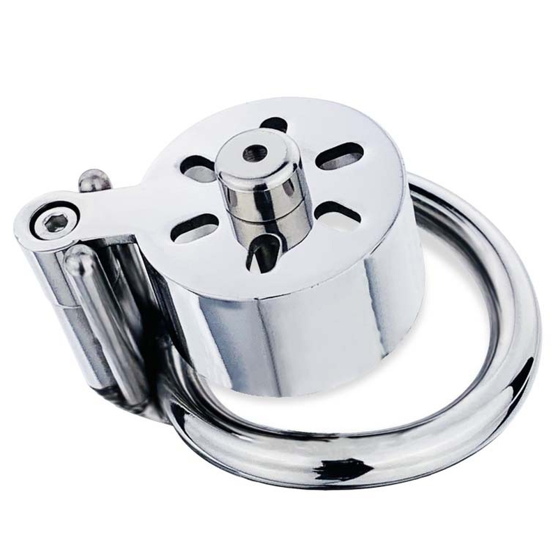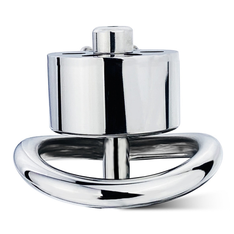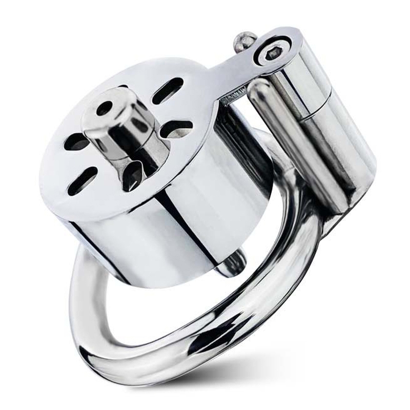 Cage de chasteté avec un plug d'urètre à l'intérieur. La cage a des dimensions réduites de 3.5 cm de longueur et de 3.3 c de largeur.Le plug pénis est percé et mesure 3.5 cm de longueur insérable et 8 mm de diamètre. Anneau de maintien à choisir. Fermetur