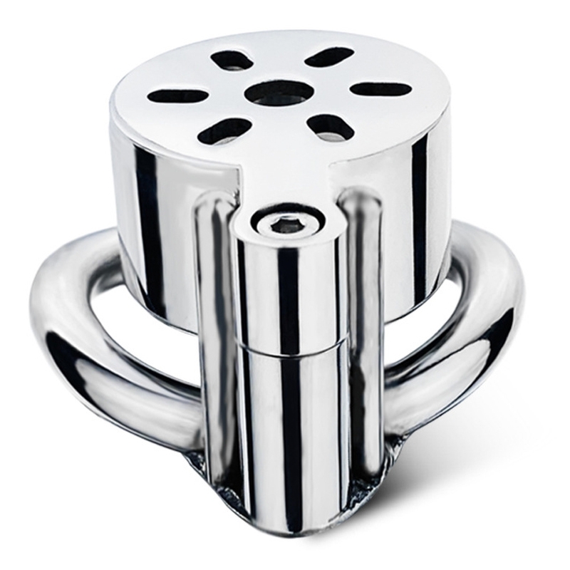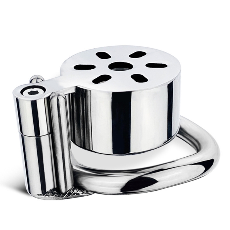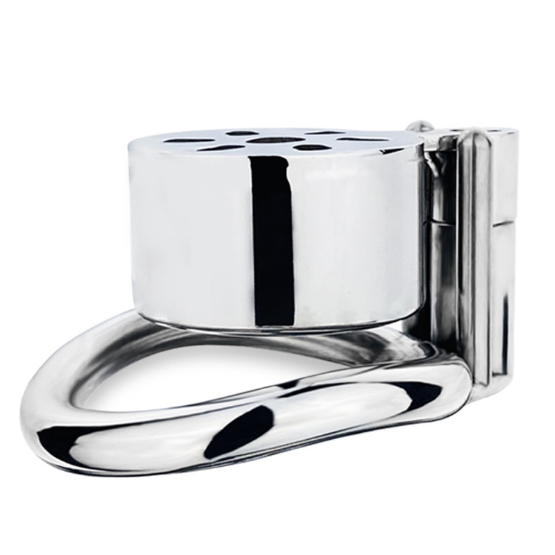 Cage de chasteté avec une longueur de 3.5 cm. Diamètre intérieur de 3.2 cm. L'extrémité est plate avec des trous. Avec l'anneau de maintien à choisir (40, 45, 50 ou 55 mm). Système avec vis.