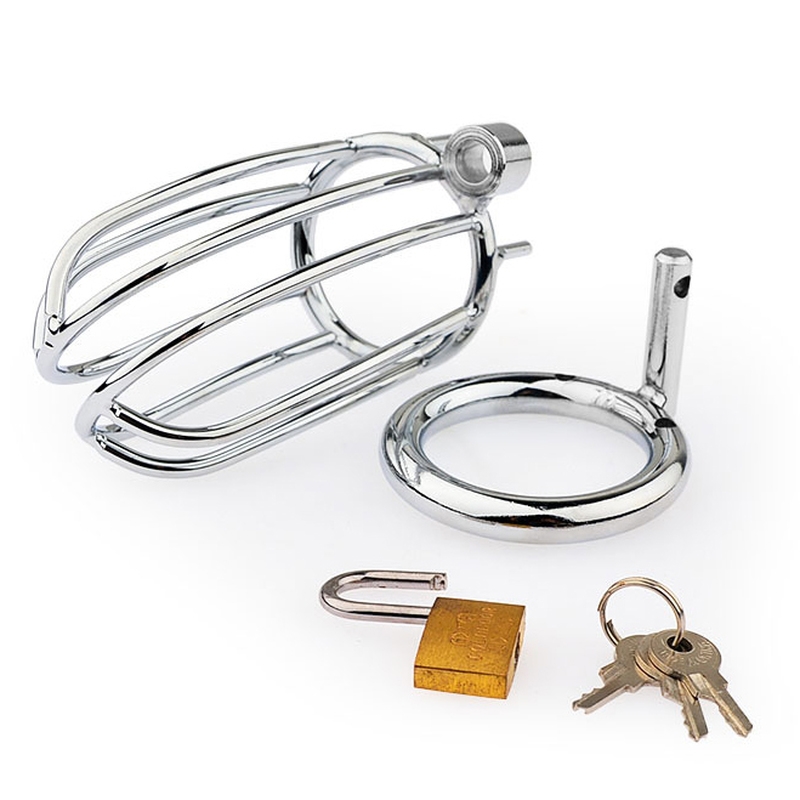 Cage de chasteté avec une forme composée de lignes fines.Longueur d'insertion de 9.5 cm. Diamètre intérieur de 3.5 cm. Anneau de maintien à choisir : 40, 45 ou 50 mm. Fermeture avec cadenas. En métal