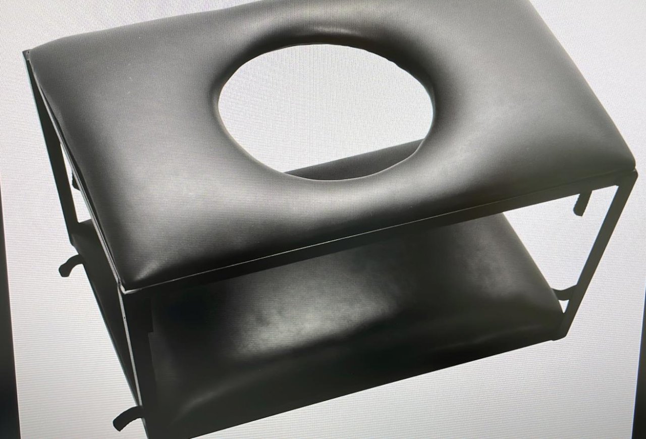 Cette chaise BDSM est composée de :la partie banc rembourré avec un trou central d'environ 30cm de diamètrele plateau bas rembourré pour un meilleur confort lors du jeu8 accessoires (4 liens nylon, masque, bâillon-boule et martinet fin)Dimensions : Longue