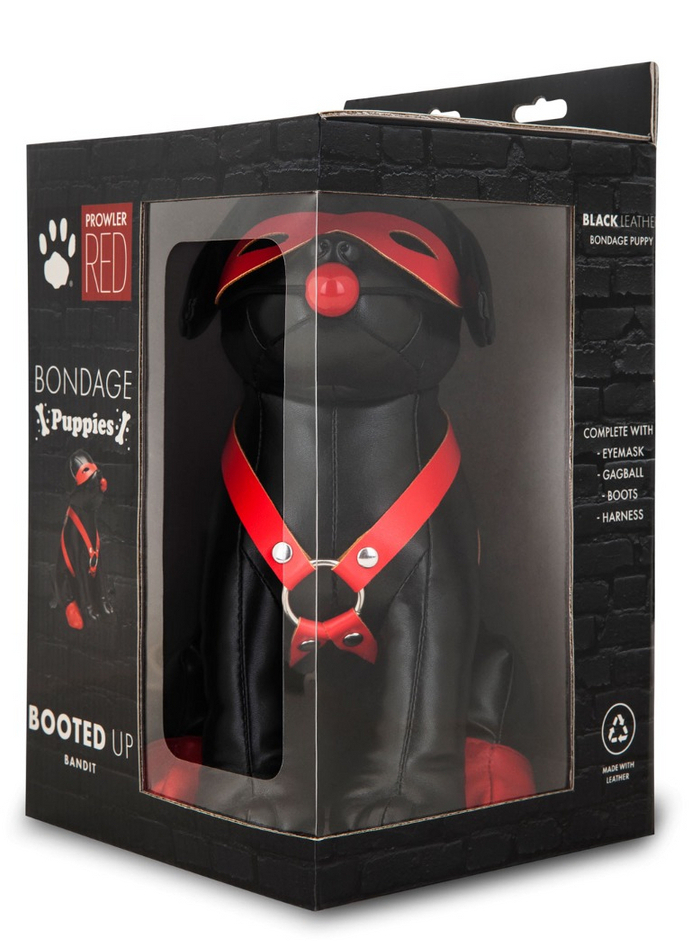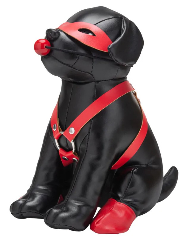 Le Chien en Simili BANDIT 24 cm Noir est un accessoire que vous voudrez exposer pour annoncer la couleur à vos invités. Il présente un masque pour les yeux rouge, un harnais, un bâillon-boule et de jolies bottes rouges sur ses pattes arrière. Offrez-le