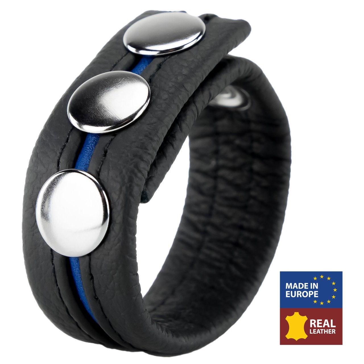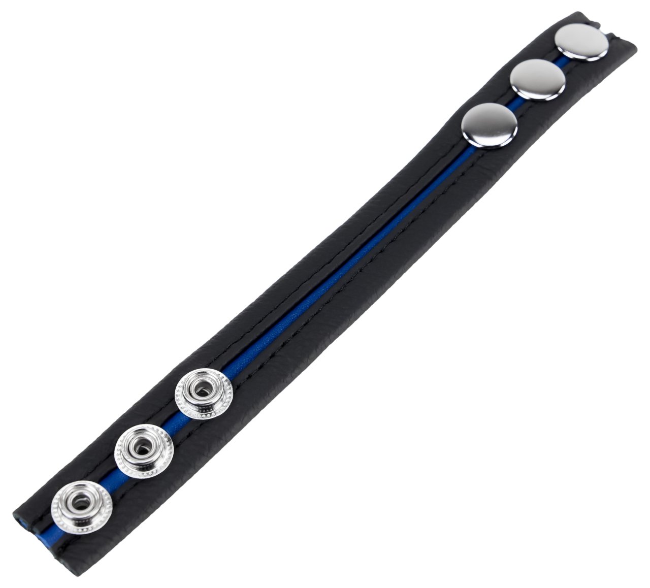 Ce cockring en cuir est un sextoy idéal pour garder une érection puissante. Il se place à la base du sexe et le serrer pour rendre les sensations intenses.Il se compose d'une largeur de 22mm avec une ligne bleue centrale. Les 3 pressions en métal permetta