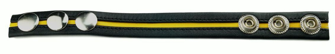 Ce cockring en cuir noir et jaune possède 3 pressions qui permettent d'ajuster le diamètre entre 40 et 55mm.Il est idéal pour renforcer l'érection et apporter des sensations plus intenses lors du rapport sexuel. Largeur de 2cm. Longueur de 21.5cm