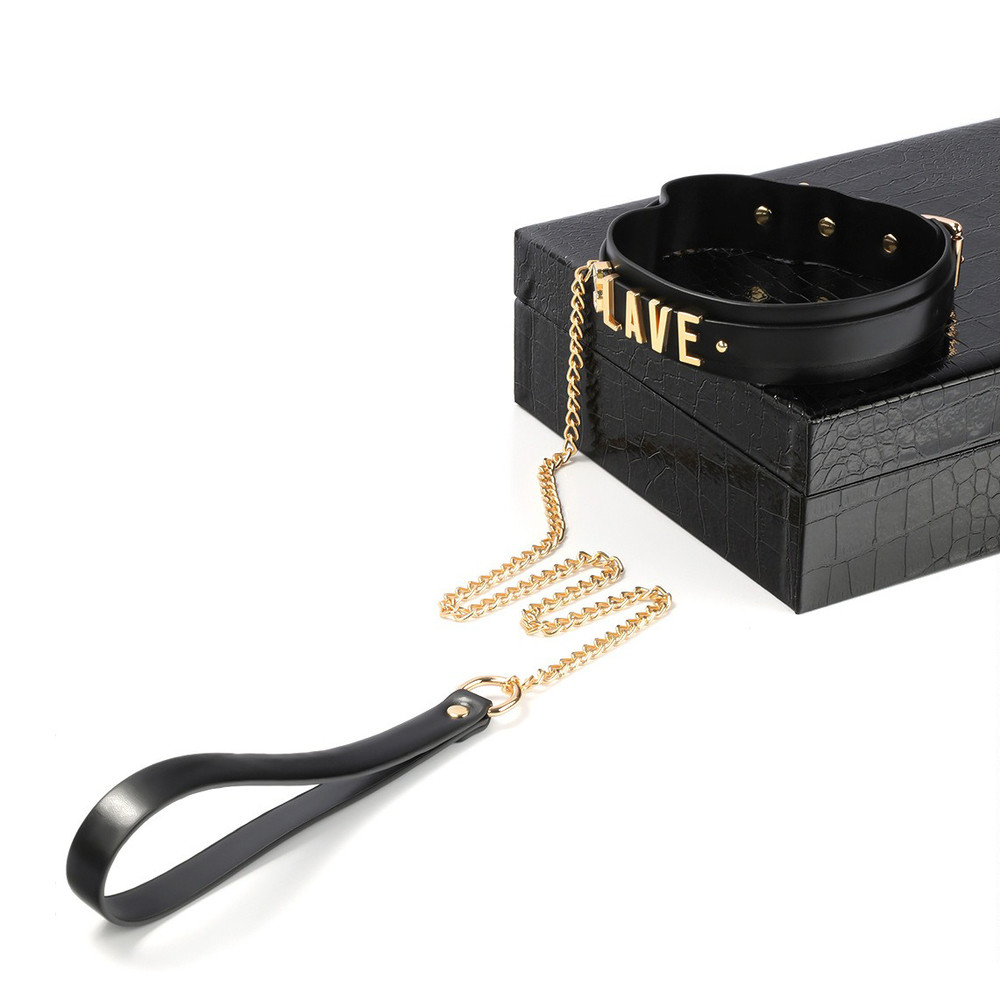 Contenant :un masque totaldes pince-tétons avec une fausse pierre rougedes menottes de poignets des menottes de chevillesun martinetun bâillon-bouleet un collier-laisse