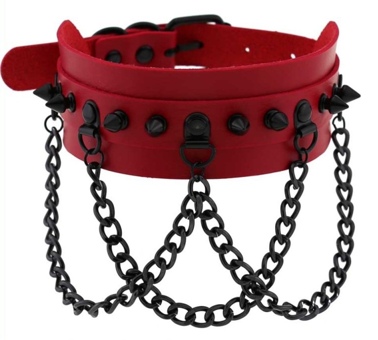 Ce collier rouge est conçu avec de courtes pointes en métal et des chaînes noires. Il donne un look élégant pour les moments sexy.La largeur du collier est de 4.5cm. Le tour de cou va de 31 à 41M. En simili (polyuréthane)