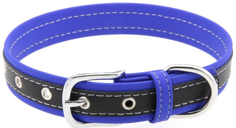 Collier ajustable de 30 à 38 cm de long. Il est large de 2 cm avec un anneau pour une laisse. Collier en simili noir et bleu foncé.