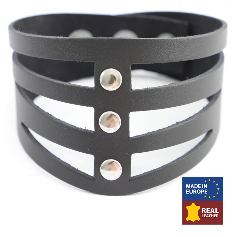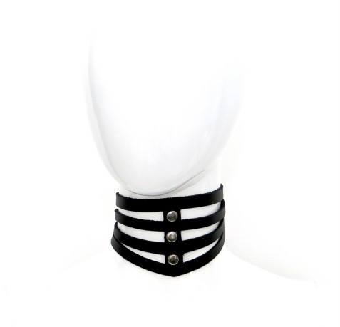 Ce collier en cuir est un accessoire de la marque The Red permettant de donner un look SM.Il se compose d'une forme en pointe avec des bandes de cuir et des rivets en métal. Le tour de cou va de 28 à 40cm. Fabriqué en cuir véritable de vache