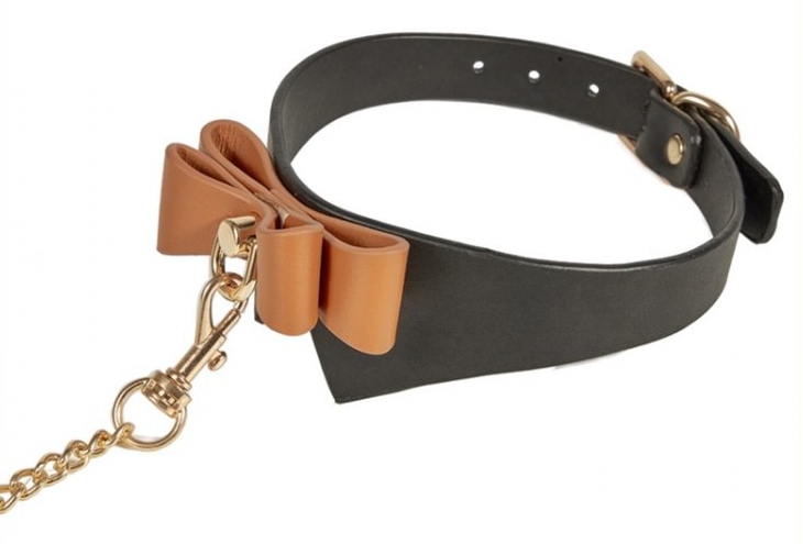 Ces collier et laisse apportent une note élégante aux moments SM. La laisse, les mousquetons et l'anneau sont en métal doré. Le collier est chic et coquin avec son noeud marron. La laisse mesure environ 1m de longueur