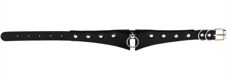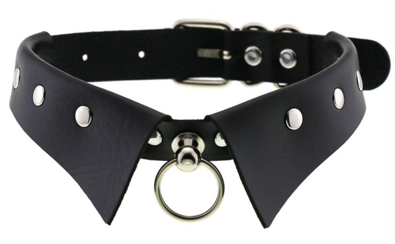 Collier avec une forme de col de chemise.Anneau en métal à l'avant.. Tour de cou allant de 34.5 à 44cm. En simili (polyuréthane)
