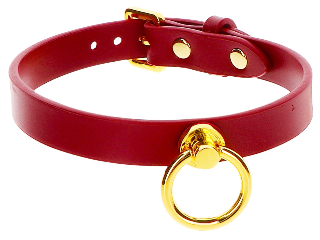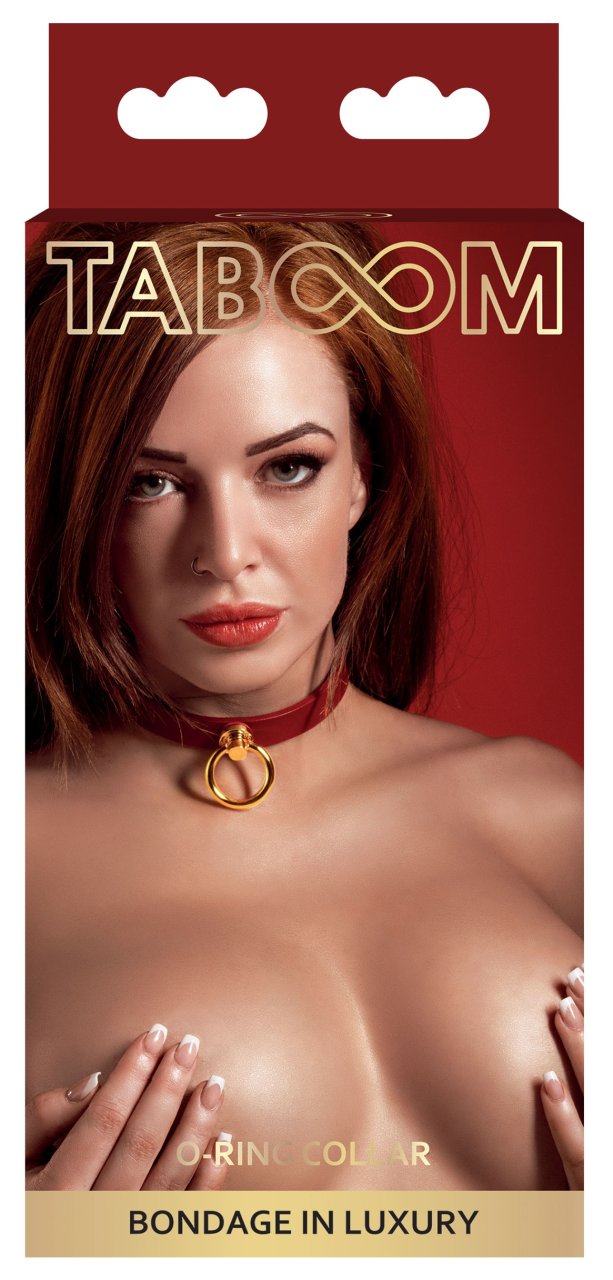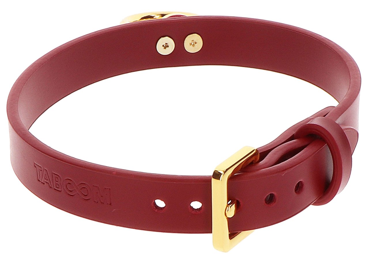 Ce collier de la marque Taboom est un accessoire élégant conçu avec un anneau doré et ds attaches de même.La sangle est rouge avec une largeur de 17mm. Elle est fabriqué en polyuréthane. Tour de cou ajustable de 34 à 39cm