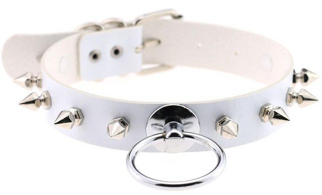 Baptisé Saskia, ce collier blanc est pourvu de pics et d'un anneau permettant d'y accrocher une laisse. Un accessoire parfait pour les jeux de soumission.