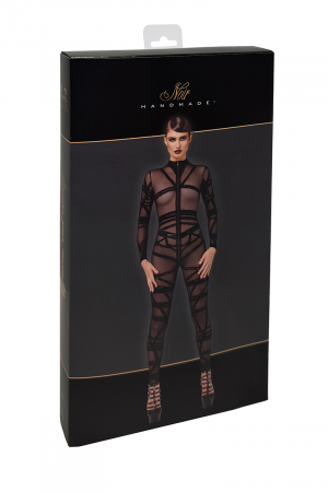 Design : Dotée d'une silhouette longue et élégante à manches longues, cette combinaison sculpte le corps du décolleté jusqu'aux chevilles. Les détails floqués complexes imitent un délicat jeu de cordes, enveloppant la silhouette avec une précision sensuelle. Une fermeture éclair à trois curseurs traverse le modèle, offrant des possibilités de style variées, allant du décolleté subtil au décolleté spectaculaire.