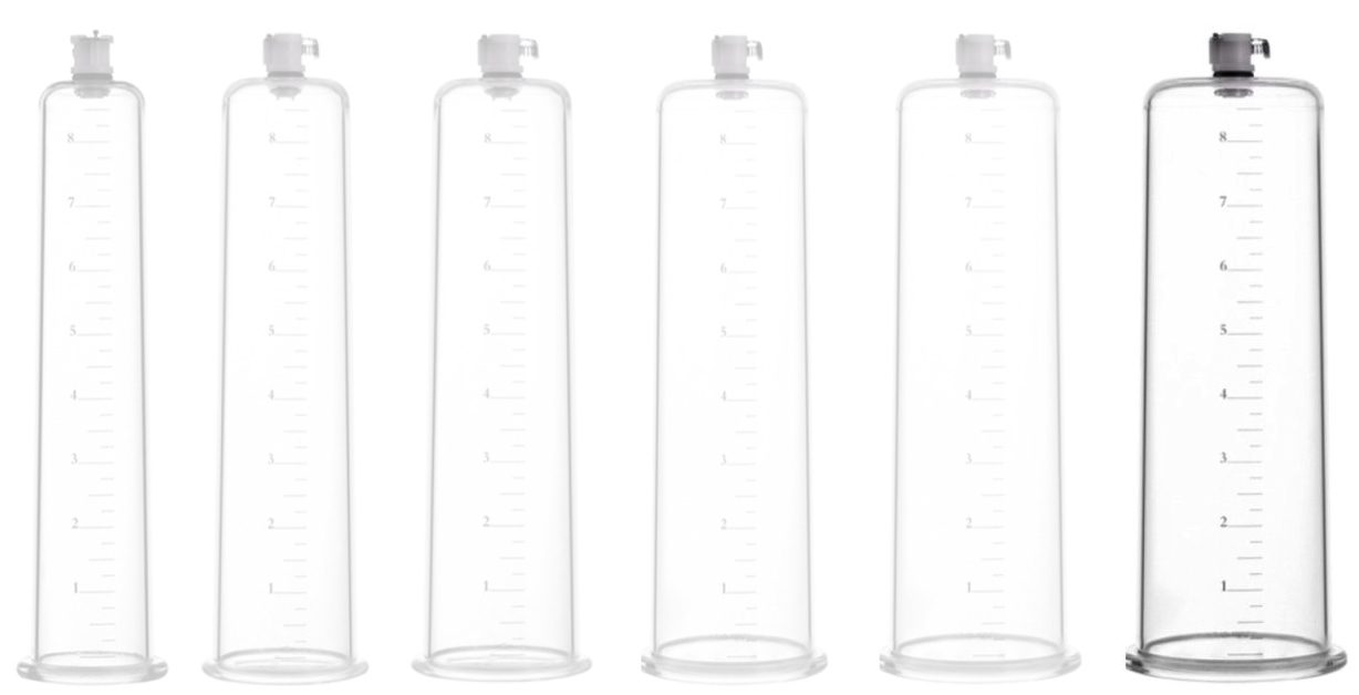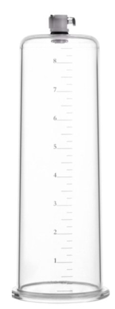 Cylindre de pompe à pénis Longueur insérable de 23 cm. Diamètre interne de 7.5 cm. Graduation en inch. Compatible avec toutes les pompes à valve universelle Tuyau flexible, manchon d'étanchéité et poignée pompe non inclus En plastique ABS.