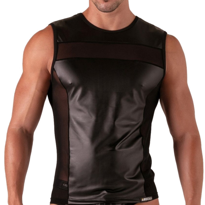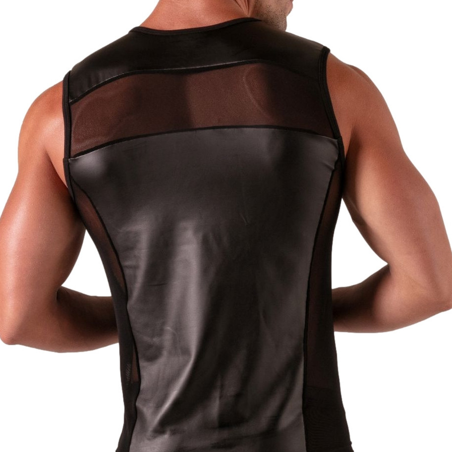 Tissu imitation cuir avec des ajouts de tissu tulle fin sur les côtés et sur la poitrine.Avec petite poche dissimulée à l'intérieur.Fabriqué en France.Composition : 90% polyester, 10% Élasthanne