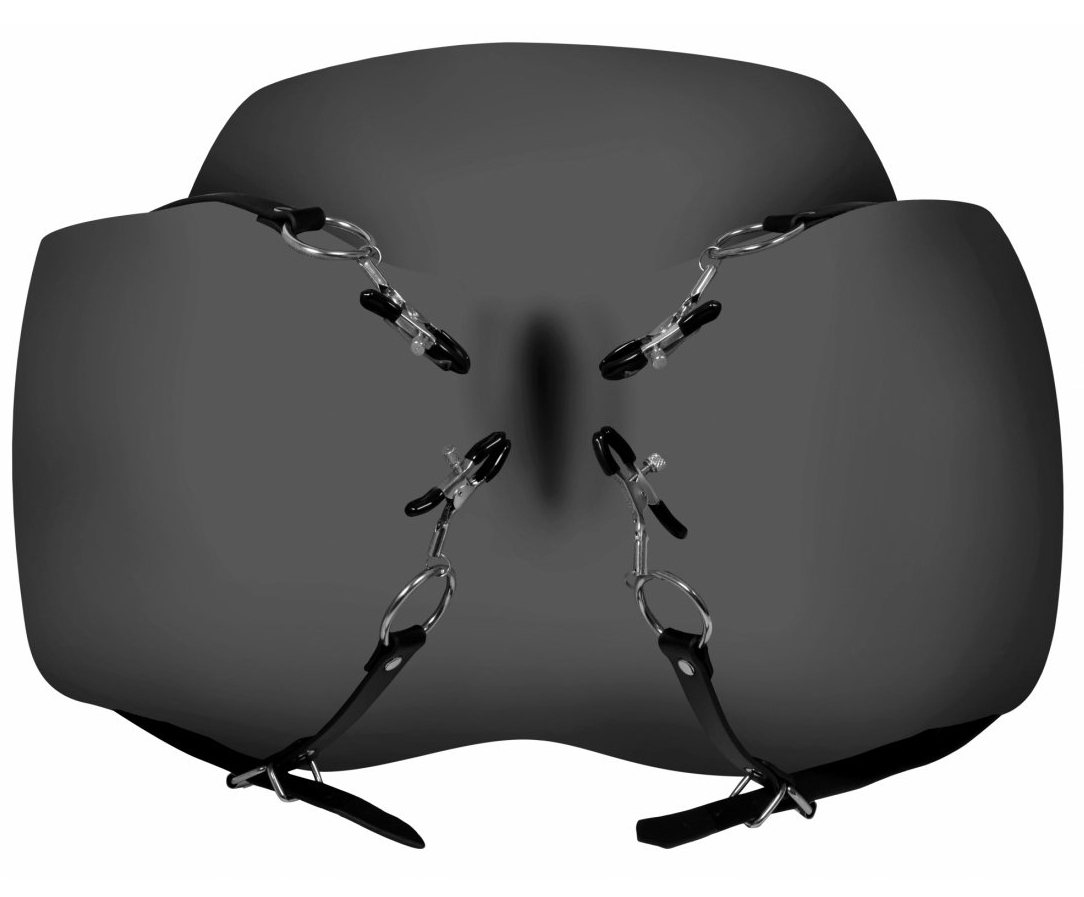 Écarteurs de lèvres vaginales avec pinces. Sangles ajustables autour des cuisses. Dimensions : Longueur des sangles de 53 à 78 cm. Largeur de sangles de 2 cm. En simili.