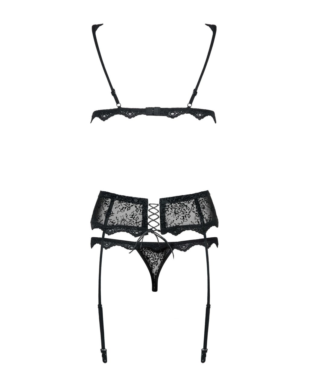 Ensemble sexy et �l�gant, parfait pour une soir�e piment�e � deux ! Il est compos� de 3 pi�ces de lingerie : un s�duisant soutien-gorge, un porte-jarretelles chic et string. Le soutien-gorge est confortable, doux avec des bretelles r�glables. Il se ferme par trois crochets pour optimiser un confort parfait ! Maille transparente d�cor�e de velours et de motifs en dentelle. Le porte-jarretelles est form� d'une large bande de maille noire piqu�e de motif en velours . String assorti et d�cor� de velours est inclus.Composition : 90% de Polyamide, 10% d'�lasthanne