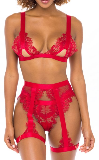Ensemble en dentelle avec : soutien-gorge bonnets en triangle avec bandes élastiques string fin porte-jarretelles ajustables. Composition : 90% polyamide, 10% élasthanne