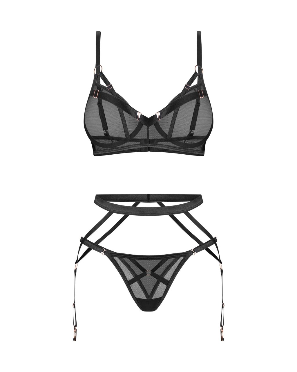 Soutien-gorge Euridia�Une sophistication �l�gante qui c�l�bre l?individualit�. La quintessence d?une libert� d?expression authentique et audacieuse. Impeccable, polyvalente et chic. Cr�ez un look unique pour vous.Un soutien-gorge moderne � armatures avec bonnets de contour en tissus souples de qualit� sup�rieure. Ajustement et fermeture � plusieurs niveaux avec crochets assurent un ajustement parfait. M�langer librement avec d?autres produits de la m�me collection.�? Soutien-gorge Euridia noir? bonnets � armatures? accents de rose dor�e? tissu souple? souci du d�tail? con�u dans l?UE? 94�% polyamide, 6�% �lasthanne Euridia porte-jarretelles�Une merveille minimaliste, un hommage � l?�l�gance �pur�e et � l?individualit�. Plongez dans un univers de luxe lib�rateur qui transcende les tendances. �pouse vos courbes sans effort, promettant confort et style. Rehaussez votre r�pertoire de lingerie avec cet ajout subtil mais s�duisant.�Un porte-jarretelles noir moderne, minimaliste, fait de tissus premium flexibles. La fermeture � crochet � plusieurs niveaux et la longueur r�glable des porte-jarretelles assurent un ajustement parfait. Un design intemporel avec une finition luxueuse.�? bretelles porte-jarretelles? fermeture r�glable � l?arri�re? Rose dor�e? tissu souple? con�u dans l?UE? 94�% polyamide, 6�% �lasthanne Euridia tanga�Une pi�ce essentielle, c�l�brant la f�minit� sauvage. Design contemporain, �quilibr� et design �pur�. R�v�lez votre essence int�rieure avec audace et authenticit�.�Minimaliste et moderne, le string dispose d?une taille r�glable, assurant un ajustement parfait adapt� � votre silhouette unique. Des accessoires m�talliques contrast�s en rose dor�e se d�tachent sur le noir �l�gant.�? string noir? ajustement de la taille? d�tails en or rose? tissus souples de la plus haute qualit�? con�u dans l?UE? 94�% polyamide, 6�% �lasthanne