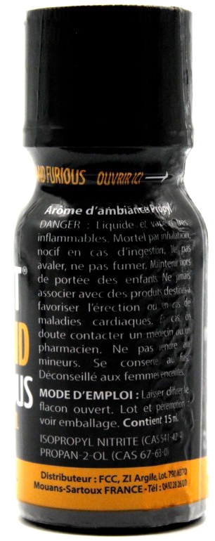 Précautions d'utilisation: Produit inflammable - ne pas mettre en contact avec une source de chaleur Ne pas ingérer Éviter le contact avec la peau, les yeux et les muqueuses En cas de problèmes, contacter un médecin ou appeler le centre anti-poison le plus proche Tenir hors de portée des mineurs Conserver dans un endroit frais et ventilé Ne pas utiliser avec des stimulants érectiles ni en cas de problèmes cardiaques, vasculaires ou d'insuffisance respiratoire Composition : Isopropyl Nitrite (CAS 541-42-4), Propan-2-ol (CAS 67-63-0)