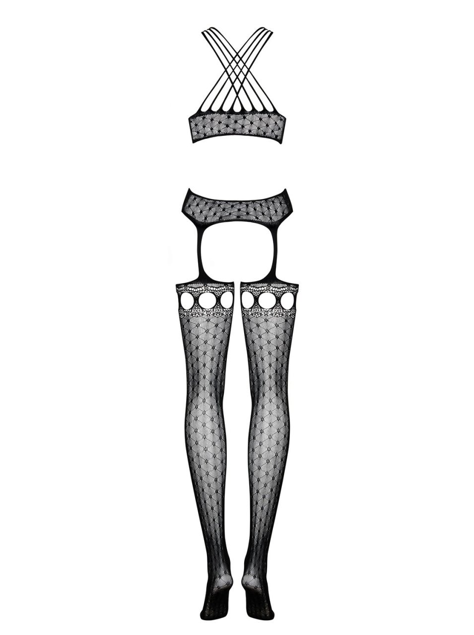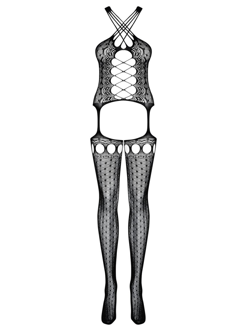 Un look unique pour ce Bodystocking noir de la marque de lingerie sexy Obsessive. Multiples bretelles qui se croisent dans le dos et sur le d�collet�, effet la�age sur l'avant, jolis motifs g�om�trique et bas ajour�s, voici un bodystocking sexy qui a un style de guepiere bas jarretelles sur l'avant et ensemble sexy 3 pieces sur l'arriere. Disponible en grande et parfaitement extensible, ce bodystocking Obsessive est compos� de 90% nylon 10% elasthane.