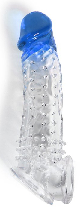 Gaine transparente avec le gland bleue.Intérieur perlé pour apporter des sensations pour celui qui la porte.Picots à la base pour une stimulation supplémentaire pour le partenaire. Dimensions extérieures de 17 x4.5 cm. Dimensions intérieures de 14 x 3 cm.