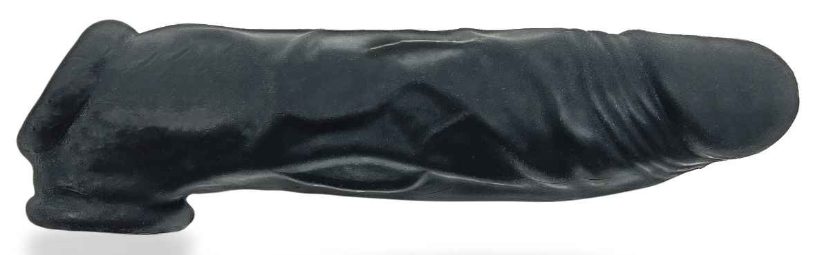 Gaine de pénis noire avec une forme réaliste et surface veinée.Longueur extérieure de 15 cm et largeur de 3.5 cm.Dimensions intérieures de 13.5 x 2.5 cm. Avec un accessoire supplémentaire qui peut réduire la longueur intérieure à 10.5 cm.En silicone soupl