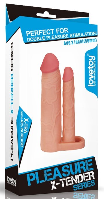 Cet accessoire de la marque LoveToy est une gaine pénienne conçue avec deux godes permettant de simuler une double pénétration avec un sexe plus gros.En effet, le gode principal est creux et le sexe s'insère à l'intérieur (sur environ 13cm). Il mesure 18c