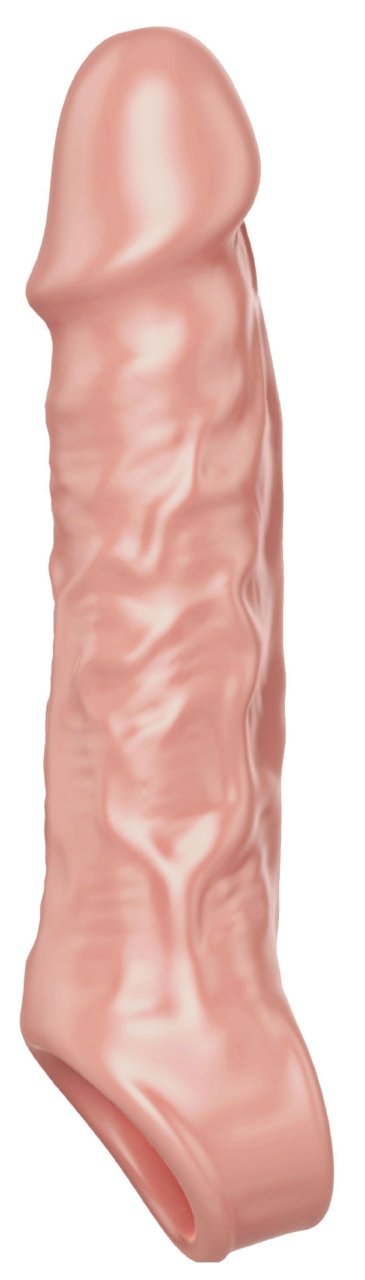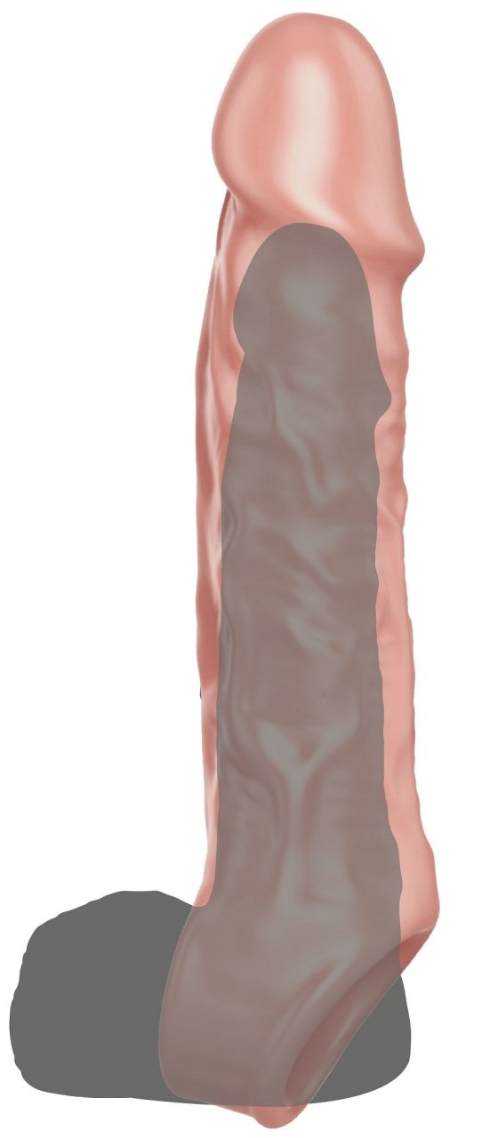 Gaine de pénis avec une forme réaliste comportant une longueur extérieure de 12 cm et une largeur de 3 cm.Les dimensions intérieures sont de 9 x 2.5 cm. Fixation au-dessus des bourses avec l'anneau. En TPE