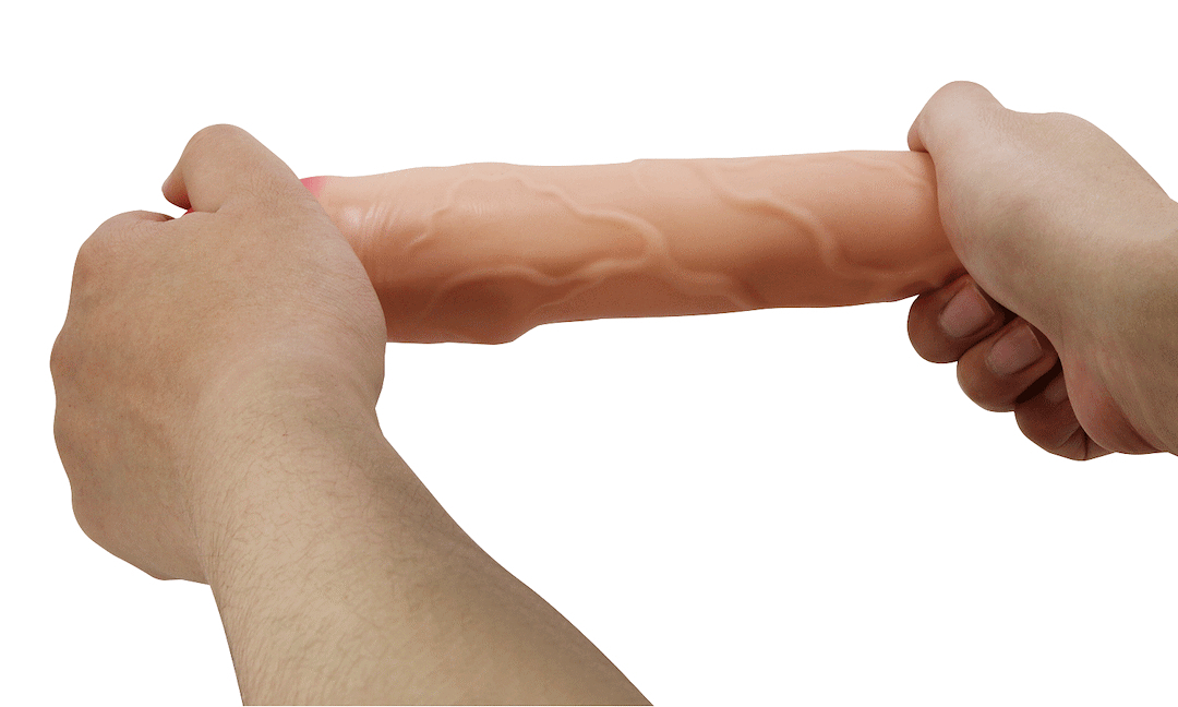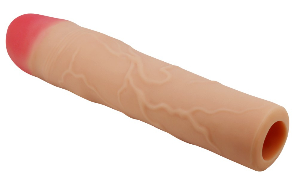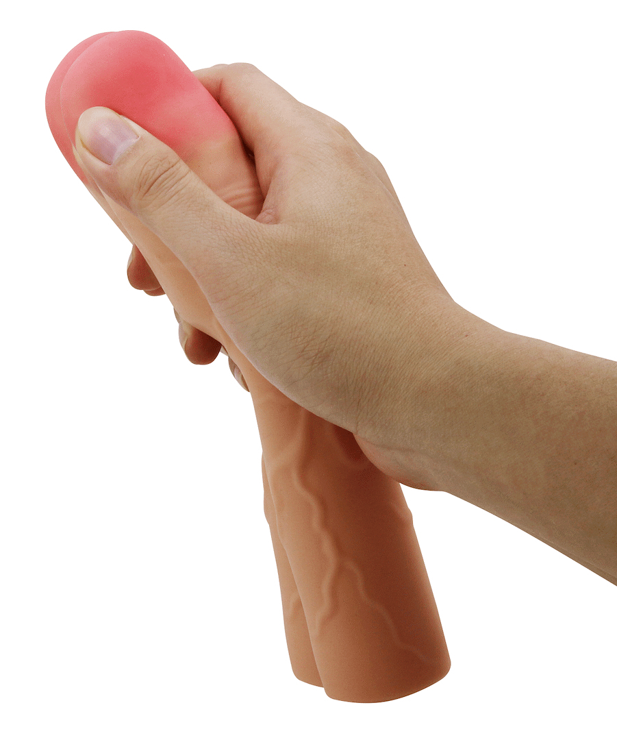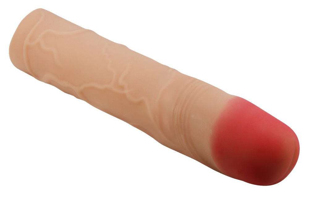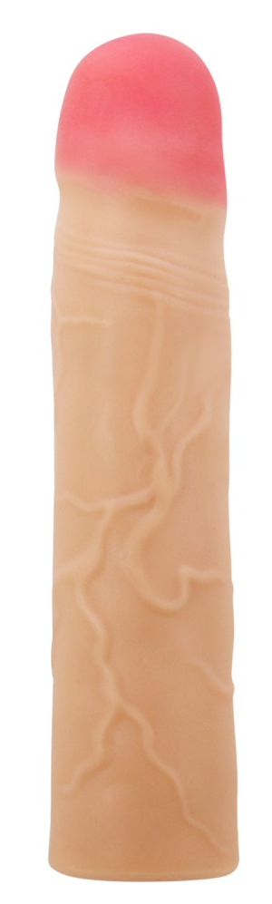 Gaine de pénis avec surface veinée et gland décalotté. Longueur insérable de 19 cm et une largeur de 3.5 à 4 cm. Diamètre de 25 mm et une longueur intérieure de 12 cm. En TPR chair.