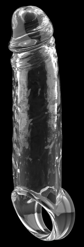 Accessoire qui permet de donner une taille plus importante au pénis.Avec une longueur insérable de 14 cm et une largeur de 4 cm. Dimensions intérieures de 10 x 3 cm.Couleur transparente. En TPE souple.
