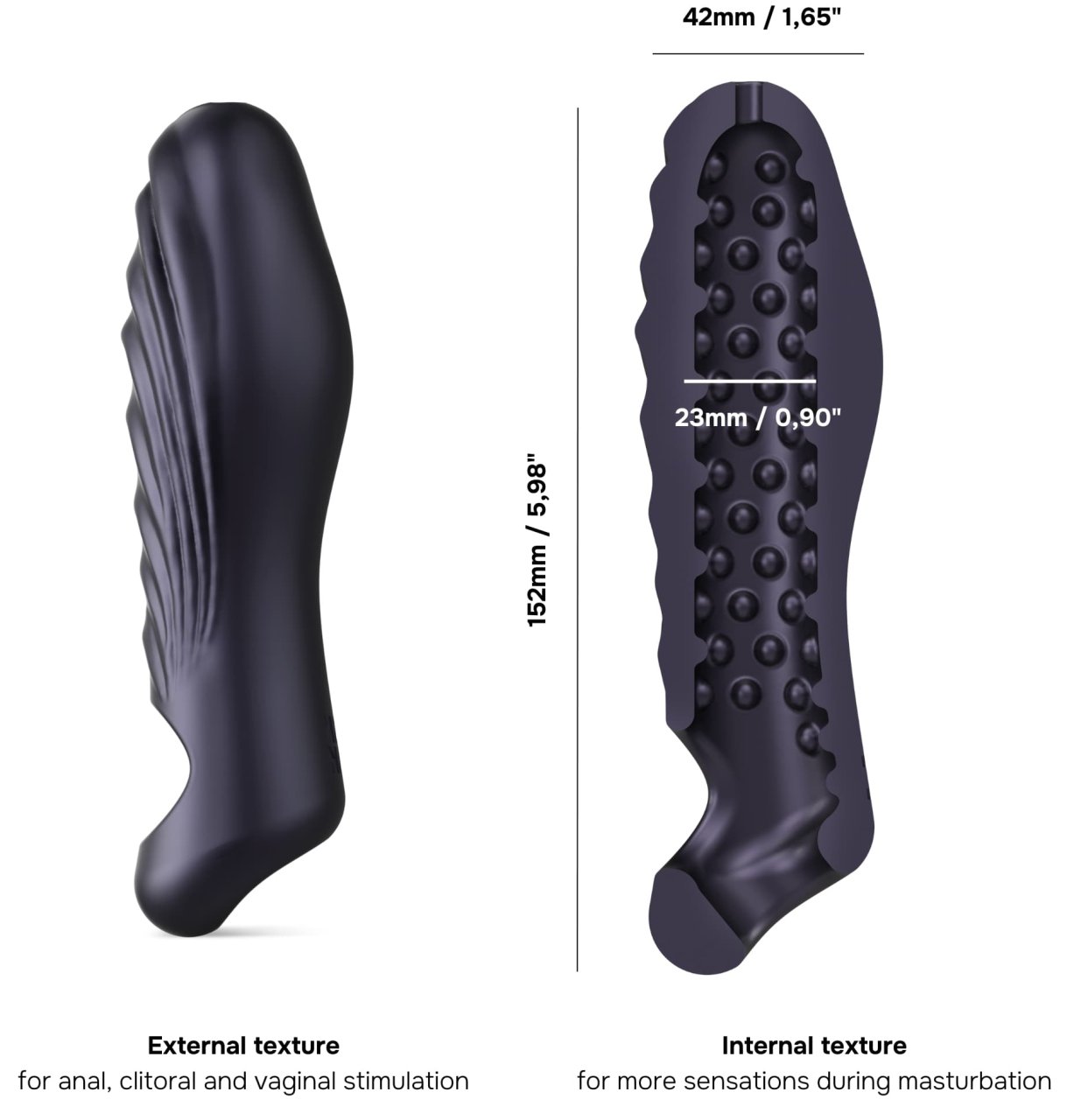 Gaine de pénis avec une surface texturée à l'extérieur et une surface perlée à l'intérieur.Longueur de 15 cm. Largeur de 4.2 cm.Diamètre intérieur de 23 mm étirable. En matière silicone souple.
