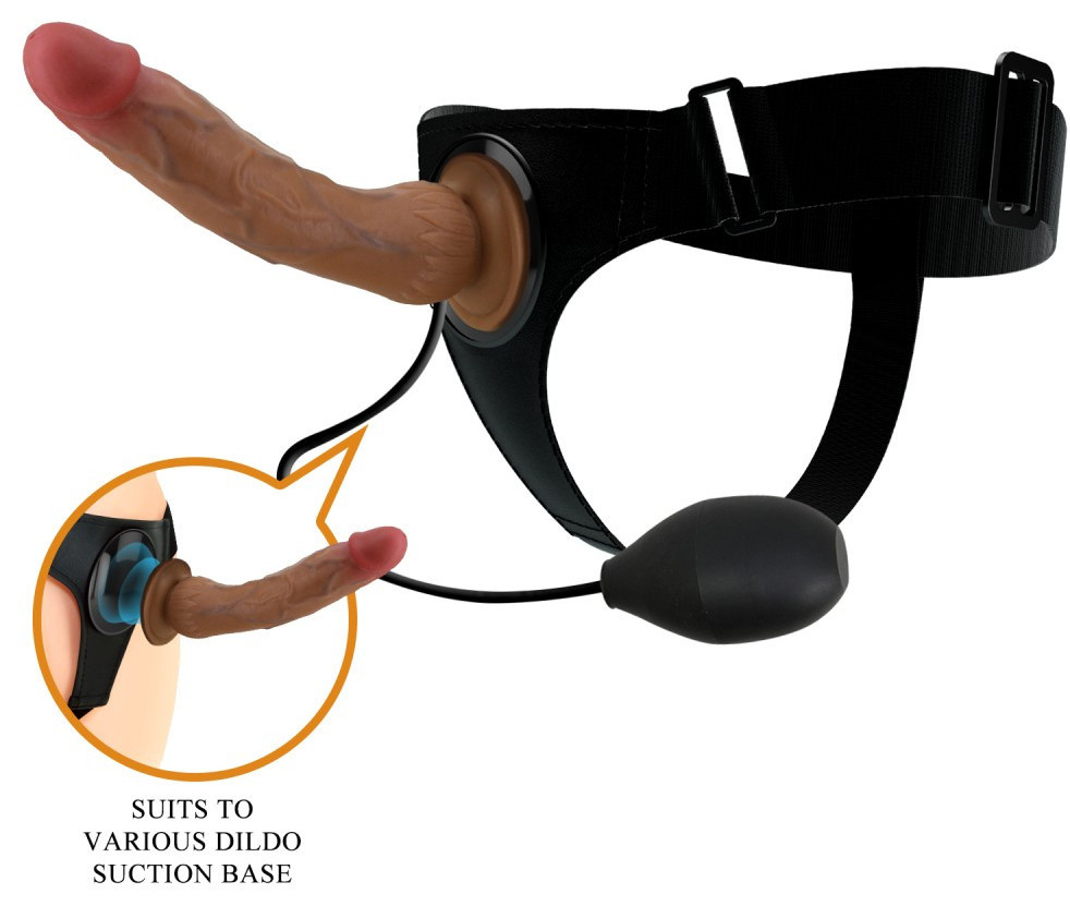 Gode ceinture avec un gode ventouse, harnais ajustable. Longueur insérable de 19 cm et largeur de 3..5 à 4.5 cm. En TPR, avec une poire pour l'éjaculation.