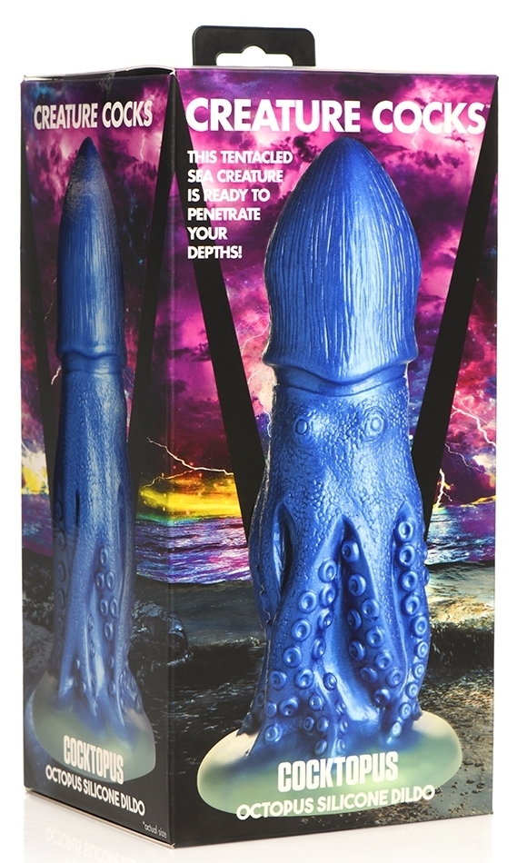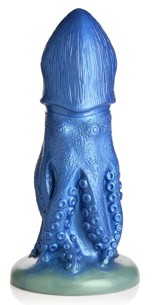 Gode monster avec une forme de pieuvre Plusieurs types de texture : lignes verticales, petits reliefs ressemblant à des écailles avec tentacules. Bleu foncé Base ventouse Longueur de 19 cm. Largeur de 7 cm au maximum En silicone