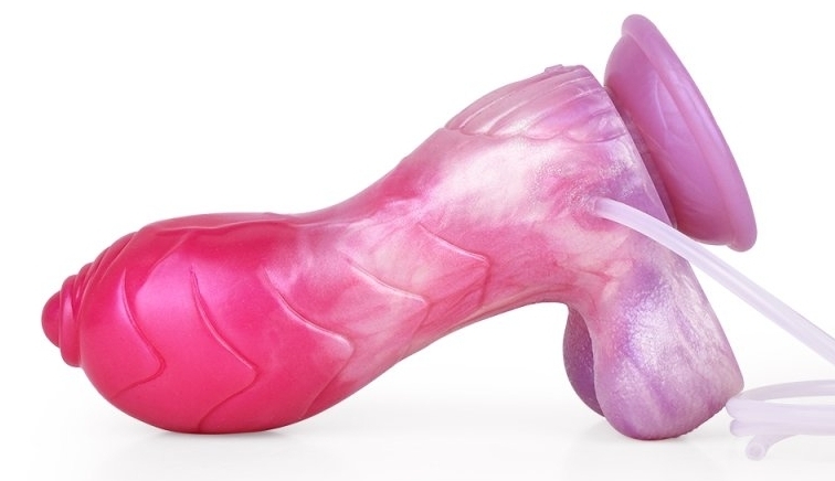 Gode rose avec une forme originale. Très petit gland arrondi. Corps puissant et très large, strié en V. Seringue de 100 ml et poire. Dimensions : Longueur insérable de 14 cm. Largeur maximale de 6 cm. En silicone.