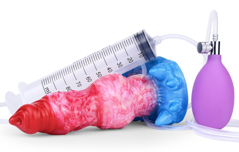 Gode gonflable de 3.1 à 9 cm (gonflé) et longueur insérable de 14 cm.Éjaculation possible grâce à une seringue de 100 ml et une poire.En silicone, avec base ventouse.