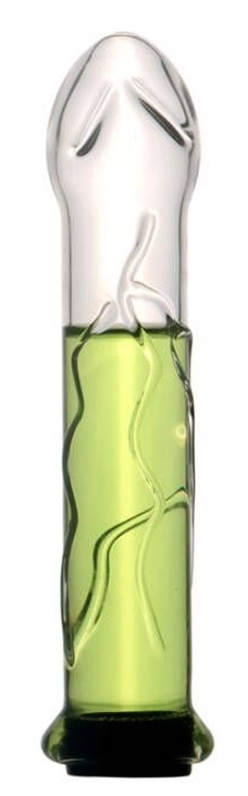 Gode creux et transparent avec surface en relief. Longueur insérable de 16 cm et largeur de 2.9 à 3.5 cm. En verre.