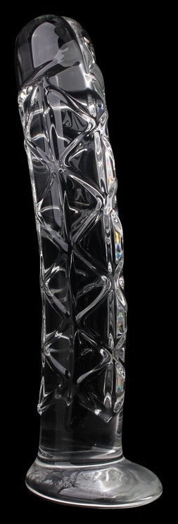 Gode avec une surface texturé, un gland décalotté et une base plate. Longueur insérable de 20 cm et largeur de 3.5 à 3.8 cm En verre transparent.