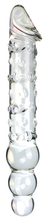 Gode avec 2 côtés différents. Gode : longueur de 18.5 cm et large de 3.8 à 4.2 cm 3 boules progressives de 10 cm de long et large de 3.2 à 4.5 cm En verre transparent.