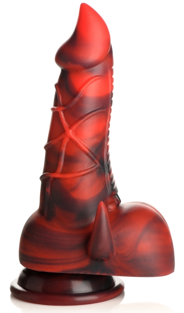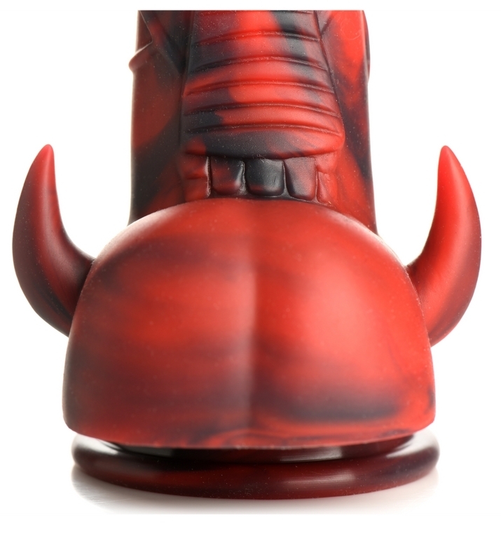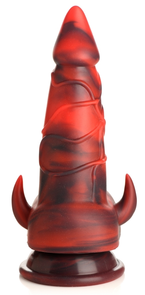 Gode monster d'une forme pointue de dard de scorpion Corps veiné avec un côté bouclier strié horizontalement pour finir sur deux cornes diaboliques Base ventouse Longueur insérable de 13 cm. Largeur de 3.5 à 5 cm. En silicone