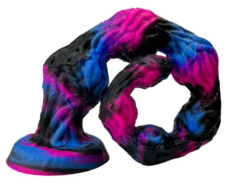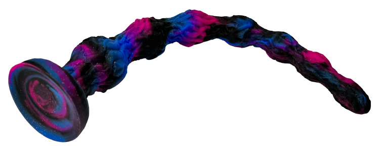 Forme volumineuse avec des boules successives et une surface texturée.Longueur de 63 cm et largeur allant de 4 à 8 cm.Base ventouse.En silicone.