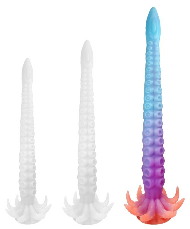 Gode avec une longueur de 55 cm et une forme de tentacule.La surface est texturée.La largeur est progressive et va de 2.5 à 7.5 cm.Avec un effet luminescent.En silicone.