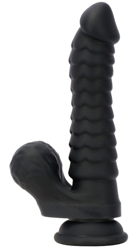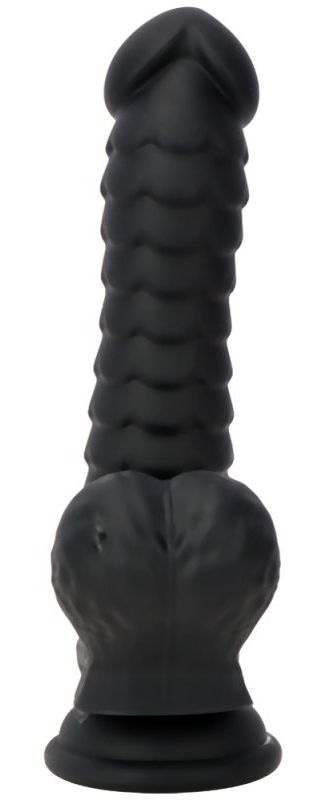 Gode en forme de sexe avec surface recouverte d'écailles. Gland décalotté bien dessiné. Bourses bien rondes. Base ventouse. Dimensions : Longueur insérable de 15 cm. Largeur maximale de 4 cm. En silicone.