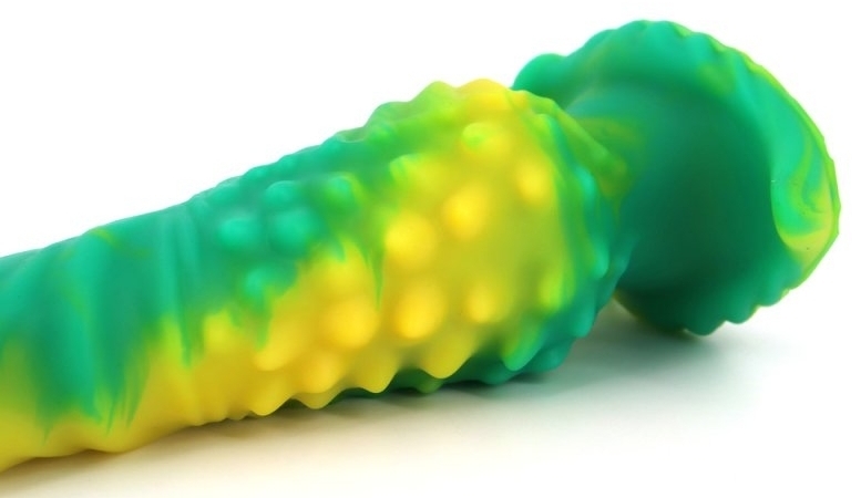 Gode à la surface texturée, avec base large. Longueur insérable de 45 cm et largeur de 1.7 à 6.8 cm. En silicone.