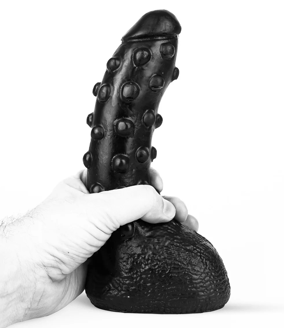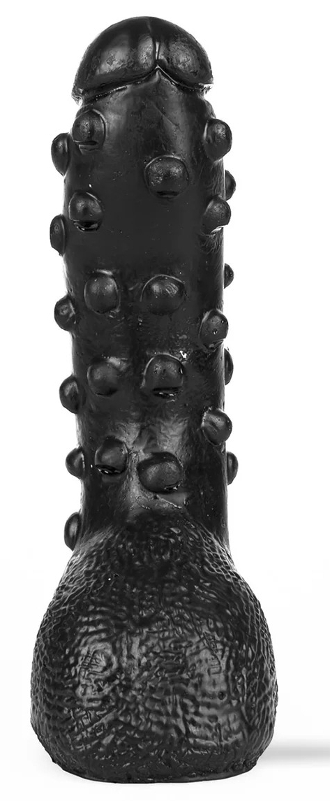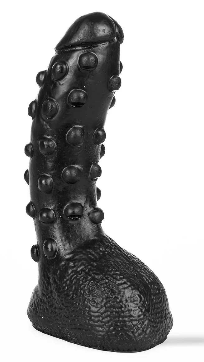 Gode noir avec une surface comportant des bulles.Largeur maximale de 5.5 cm. Longueur insérable de 22 cm. En PVC